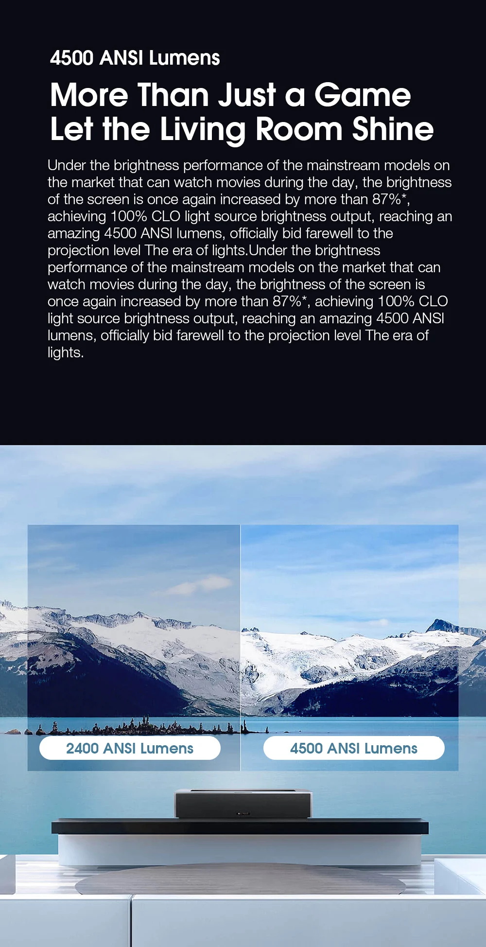 The screen brightness is as high as 4500 ANSI lumens, and the brightness of laser TV products on sale in far supermarkets is higher than the cinema standard, officially bid farewell to the era of projection and turn off lights.